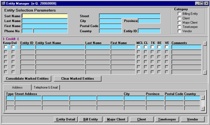 Entity Consolidation is a feature that can only be used by those who have Administrative and/or Accounting privileges in the e-Q system. Entity Consolidation is performed though the Entity Manager screen, and allows the user to "merge" multiple entitles into one.