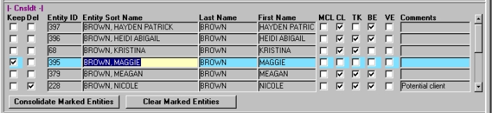 From the query results, the user must select the entity into which the other(s) are being consolidated. In other words, the user must select which entity is being "kept"