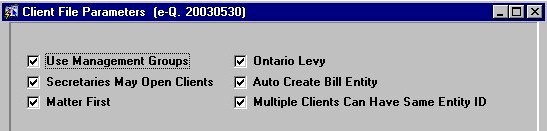 rights can use this routine. Note: Most of the Parameters maintained in this routine are defaults used throughout the system. For example, if the user uses the "Default Matter" option when opening a new Matter in the Maintain Matter Information routine, the parameters specified in this routine will be applied as defaults to the new Matter. To overwrite default values, the user may simply specify a different option/value. When the Client File Parameters routine is accessed from the eQuinox main menu, the screen shown below will be displayed. |